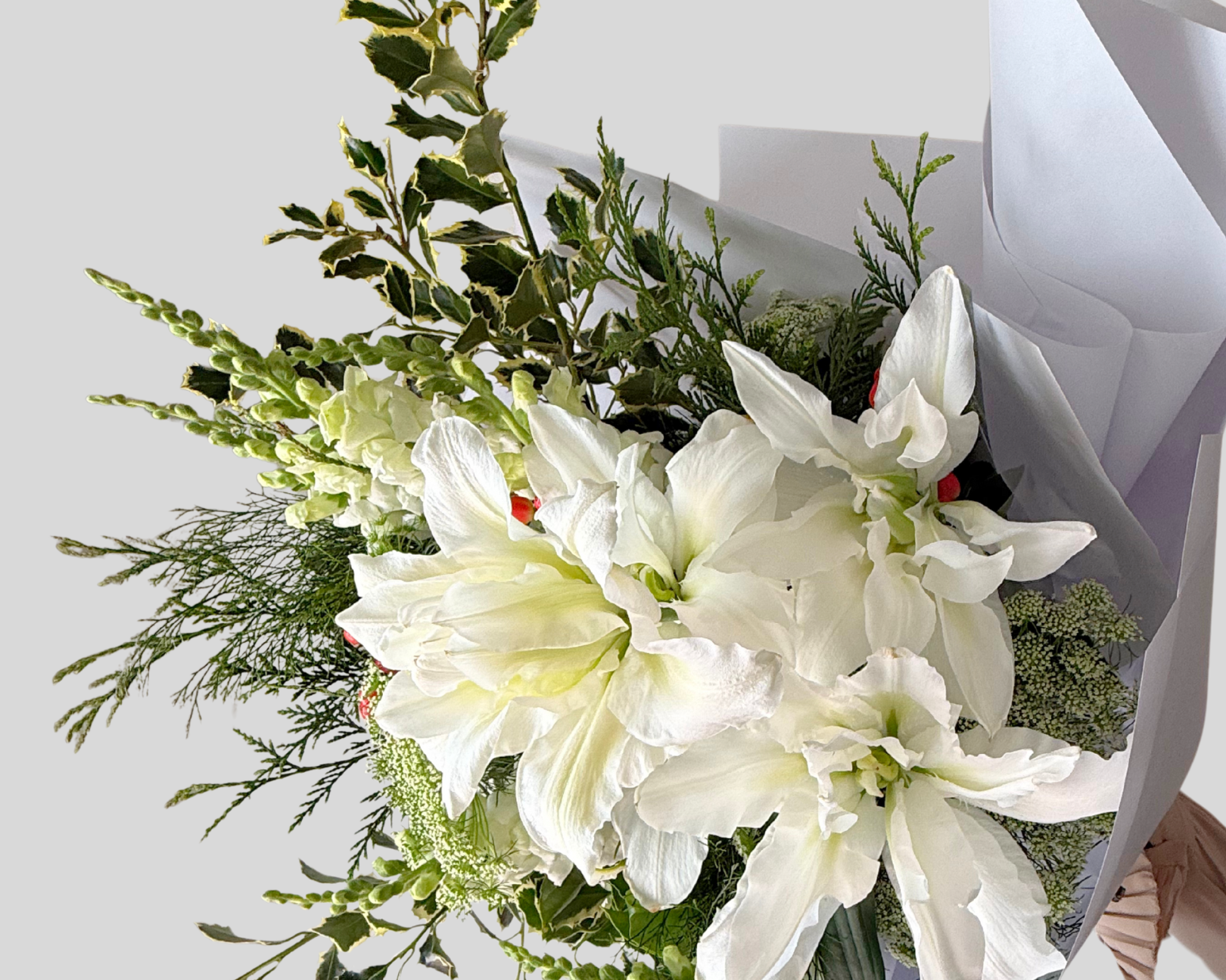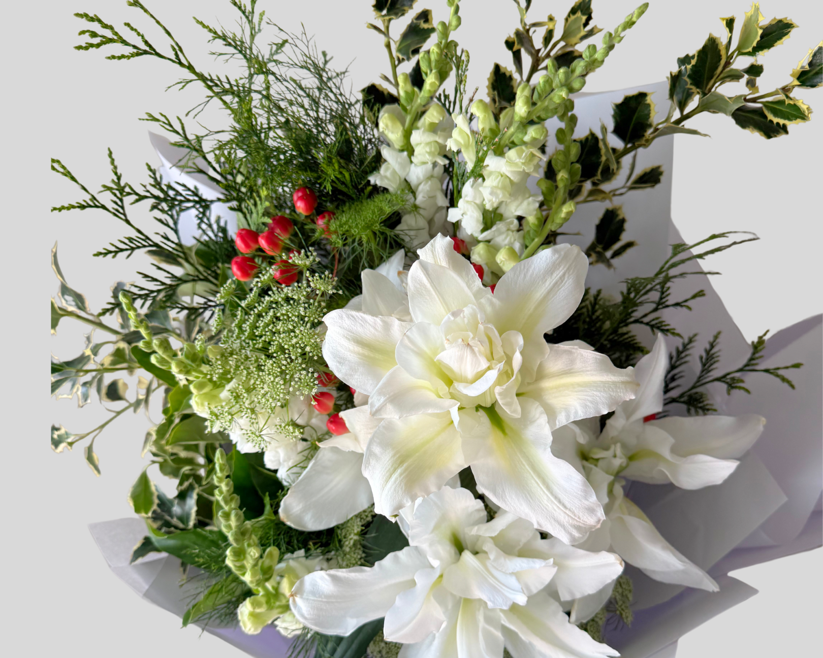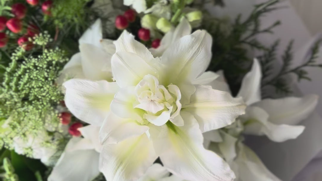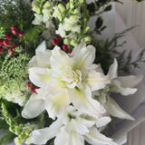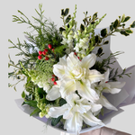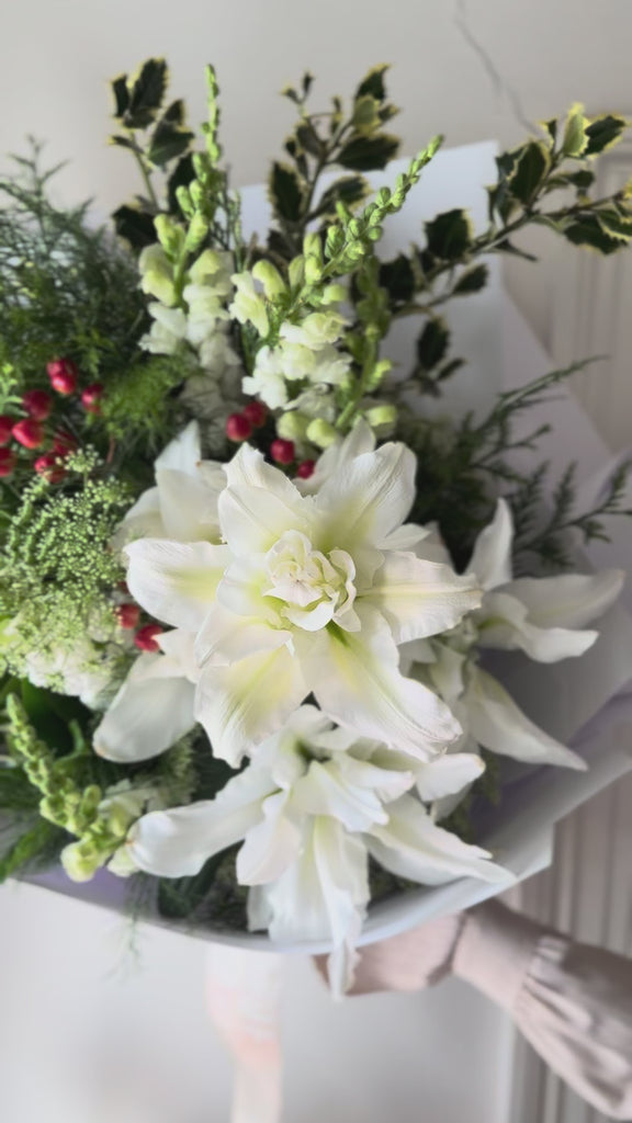Celebrate the season with our festive Florist Choice Christmas Bouquet, handcrafted with fresh white blooms, vibrant Christmas berries, classic holly, and fragrant touches of pine. Each arrangement is uniquely designed using the best of the week’s seasonal flowers — perfect for gifting, decorating, or adding holiday charm to your home.